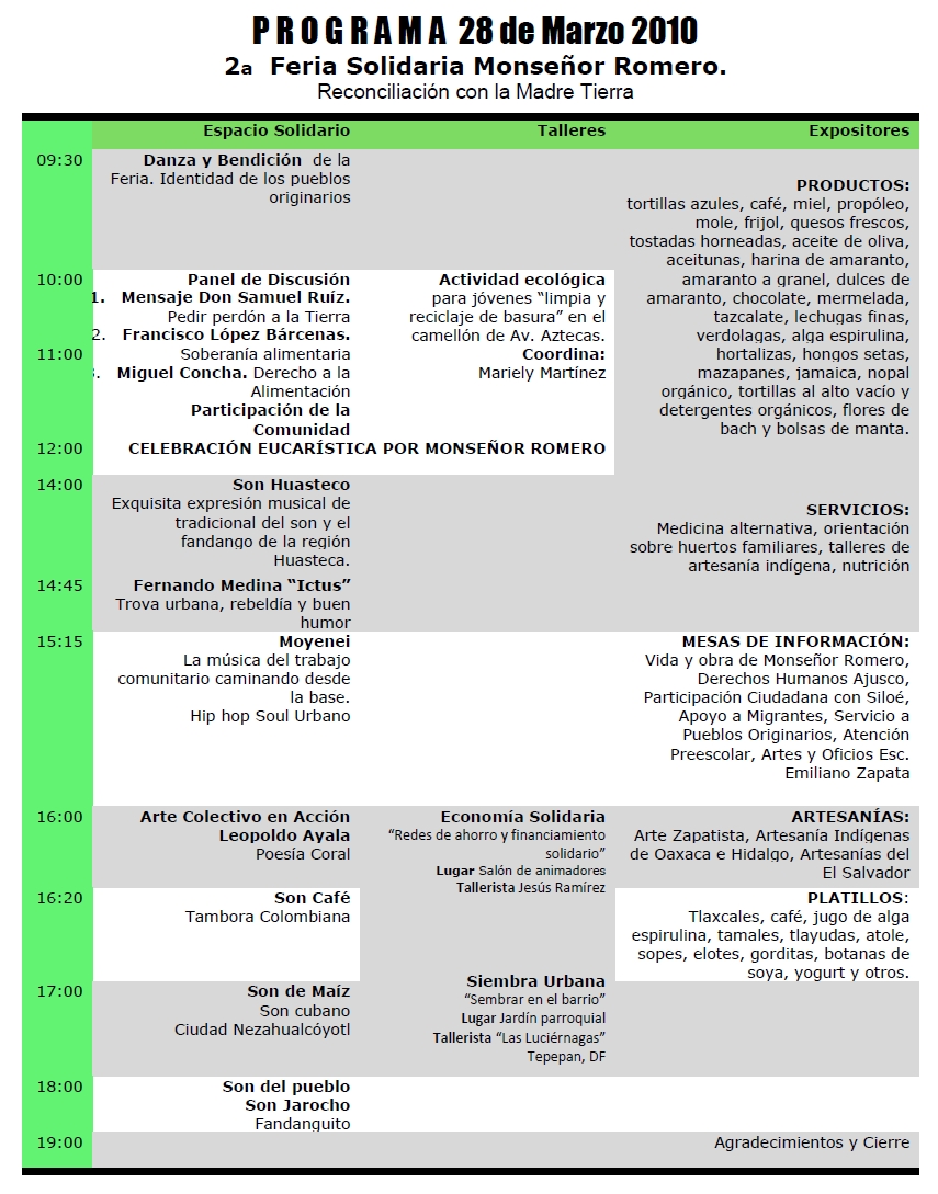 Programa de la Segunda Feria Solidaria Monseñor Romero 28 de marzo comiteajusco8 marzo 2010Información sobre derechos humanos Navegación de entradas AnteriorSiguiente Comparte esto: Compartir en X (Se abre en una ventana nueva) X Comparte en Facebook (Se abre en una ventana nueva) Facebook Me gusta Cargando... Relacionado