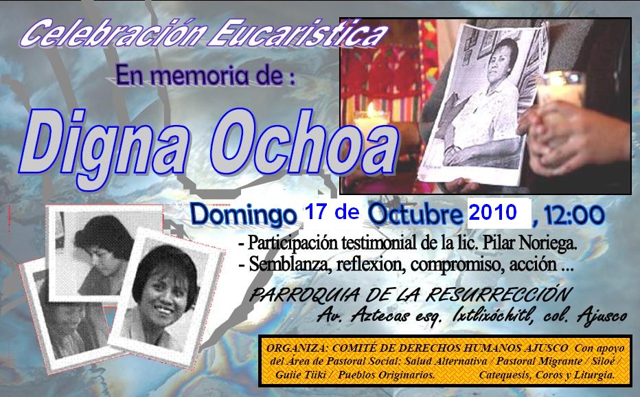 DIGNA OCHOA: ¡Porque no te olvidaremos!! Misa en memoria de Digna, y de todas las defensoras y todos los defensores de los derechos humanos. Domingo 17 de octubre, 12:00 horas (Iglesia de la Resurrección, Av. Aztecas esq. Ixtlixochitl, col. Ajusco)