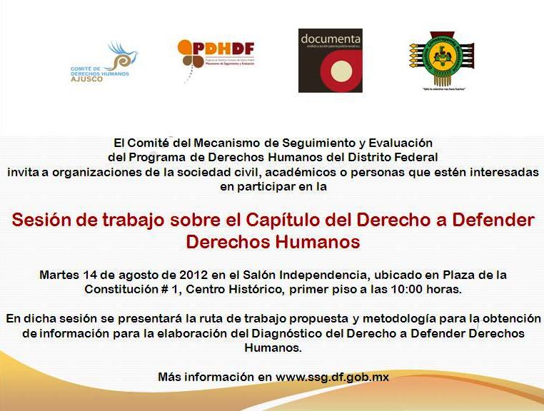 Se convoca a las organizaciones defensoras de derechos humanos, instituciones educativas, movimientos sociales y todo aquel interesado desde lo individual o colectivo en el tema del derecho a defender derechos humanos, para participar en la elaboración del Diagnóstico sobre el Derecho a Defender Derechos Humanos en el Distrito Federal.