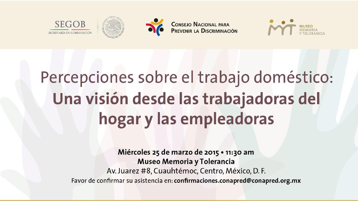 CONAPRED: «Percepciones sobre el trabajo doméstico: una visión desde las trabajadoras del hogar y las empleadoras” comiteajusco19 marzo 2015Acciones o eventos de otras organizaciones, Contra la discriminación Navegación de entradas AnteriorSiguiente Comparte esto: Compartir en X (Se abre en una ventana nueva) X Comparte en Facebook (Se abre en una ventana nueva) Facebook Me gusta Cargando... Relacionado
