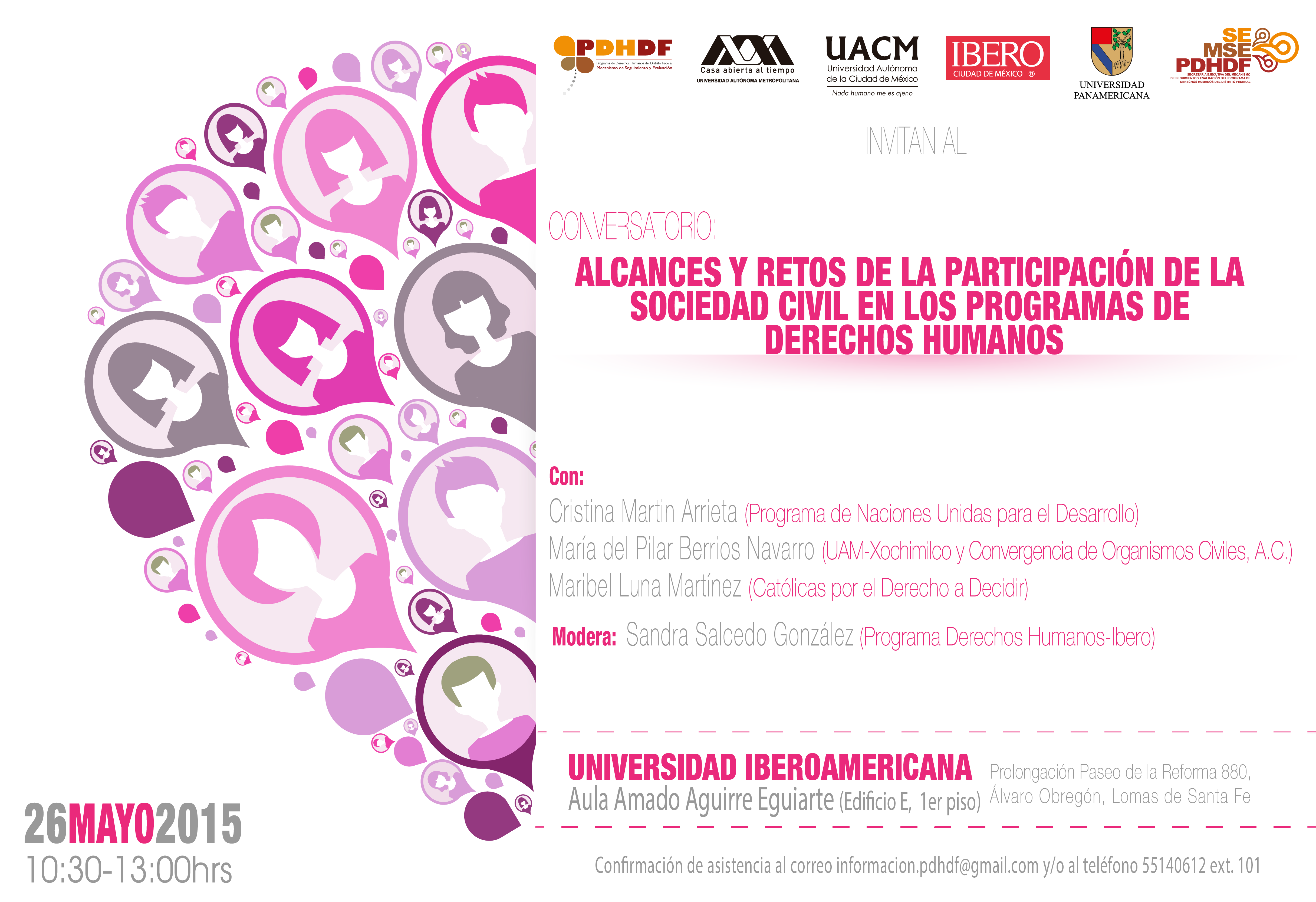 En el marco del 3er aniversario de la Secretaría Ejecutiva del Mecanismo de Seguimiento y Evaluación del PDHDF, se realizará el conversatorio denominado «Alcances y Retos de la Participación de la Sociedad Civil en los Programas de Derechos Humanos», este próximo martes 26 de mayo, de 10:30 a 13:00 hrs., en el Aulta Amado Aguirre Eguiarte (Edificio E, 1er Piso), de la Universidad Iberoamericana Ciudad de México, ubicada en Prolongación Paseo de la Reforma 880, Lomas de Santa Fe.