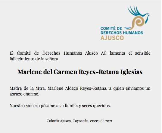 El Comité DH Ajusco AC lamenta el fallecimiento de Marlene del Carmen Reyes-Retana Iglesias comiteajusco8 enero 2021Historia del Comité Ajusco Navegación de entradas AnteriorSiguiente Comparte esto: Compartir en X (Se abre en una ventana nueva) X Comparte en Facebook (Se abre en una ventana nueva) Facebook Me gusta Cargando... Relacionado