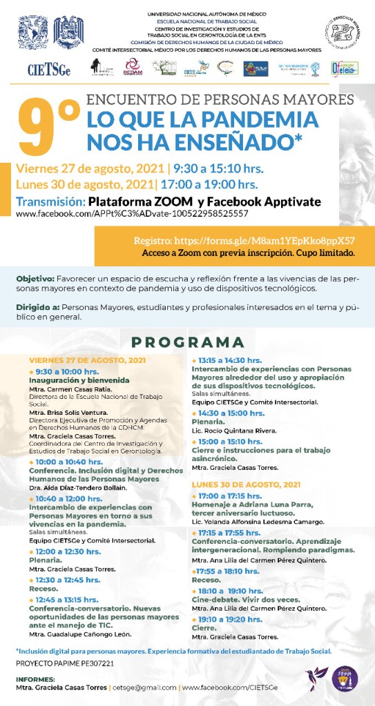 9° Encuentro de Personas Mayores “Lo que la pandemia nos ha enseñado”. Actividad coordinada por el Centro de Investigación y Estudios de Trabajo Social en Gerontología (CIETSGe) de la Escuela Nacional de Trabajo Social (ENTS) de la Universidad Nacional Autónoma de México (UNAM), la Comisión de Derechos Humanos de la Ciudad de México y el Comité Intersectorial “México por los Derechos Humanos de las Personas Mayores”.