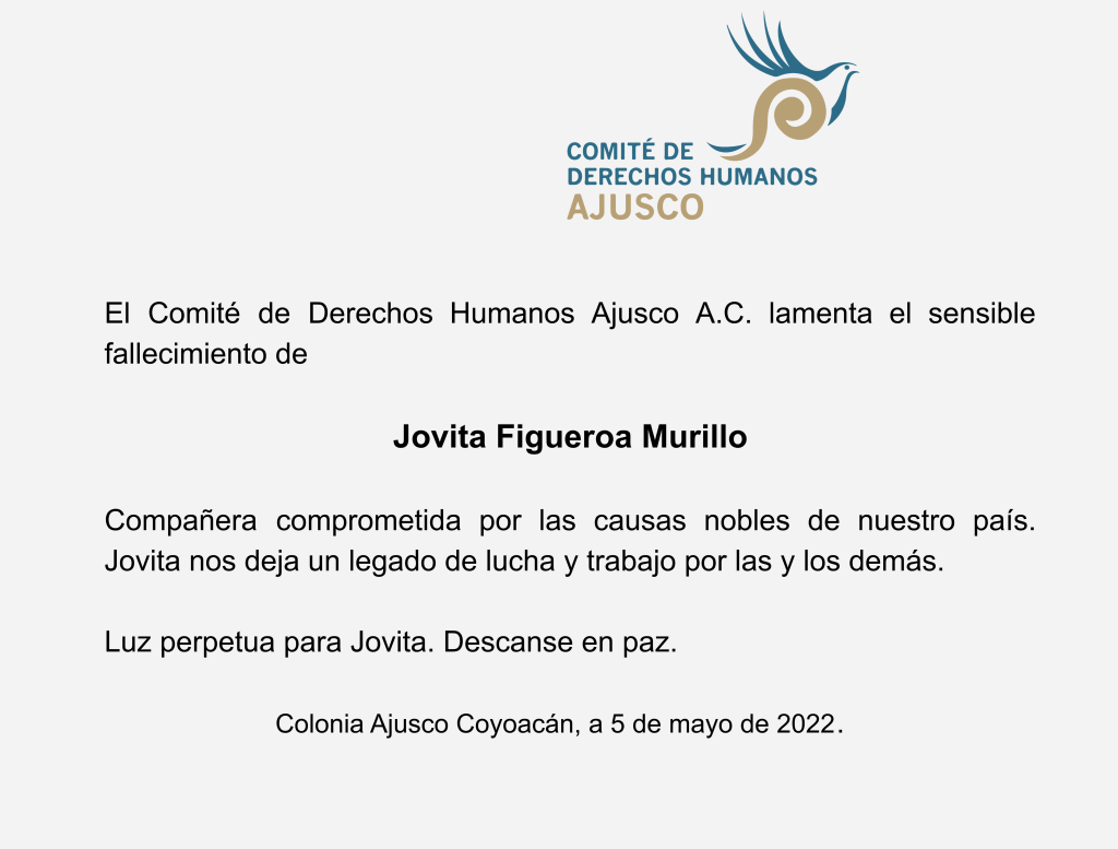 El Comité de Derechos Humanos Ajusco A.C. lamenta el sensible fallecimiento de Jovita Figueroa Murillo. Compañera comprometida por las causas nobles de nuestro país. Jovita nos deja un legado de lucha y trabajo por las y los demás.