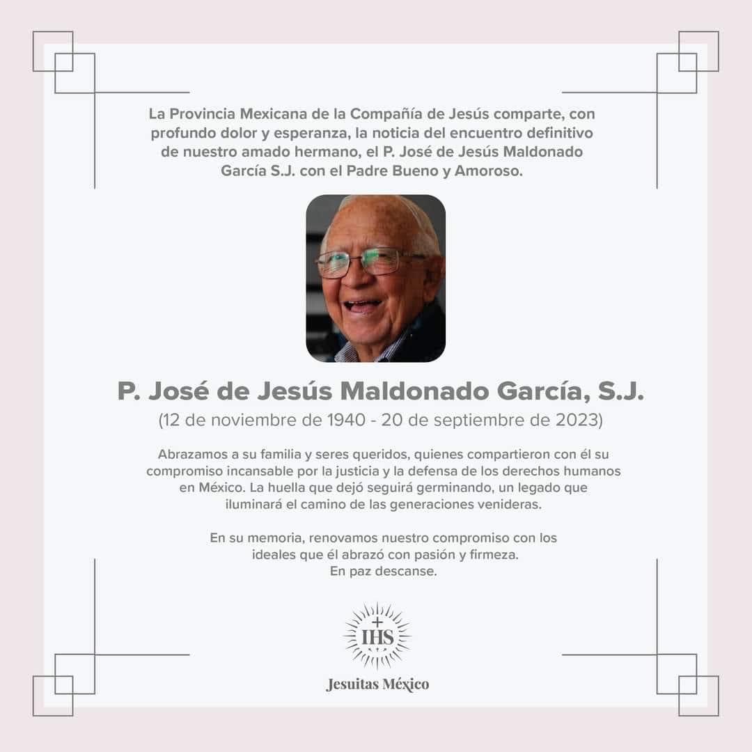 En paz descanse Jesús Maldonado García S.J. Fundador de universidades y organizaciones civiles de derechos humanos, entre ellas el Comité de Derechos Humanos Ajusco AC comiteajusco20 septiembre 2023Historia del Comité Ajusco Navegación de entradas AnteriorSiguiente Comparte esto: Compartir en X (Se abre en una ventana nueva) X Comparte en Facebook (Se abre en una ventana nueva) Facebook Me gusta Cargando... Relacionado