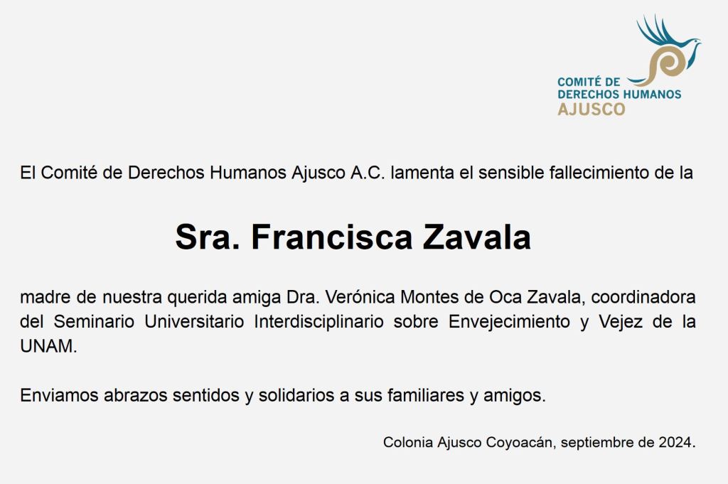 El CDHAjusco lamenta el fallecimiento de la Sra. Francisca Zavala. comiteajusco23 septiembre 202415 septiembre 2025Historia del Comité Ajusco Navegación de entradas AnteriorSiguiente Comparte esto: Compartir en X (Se abre en una ventana nueva) X Comparte en Facebook (Se abre en una ventana nueva) Facebook Me gusta Cargando... Relacionado