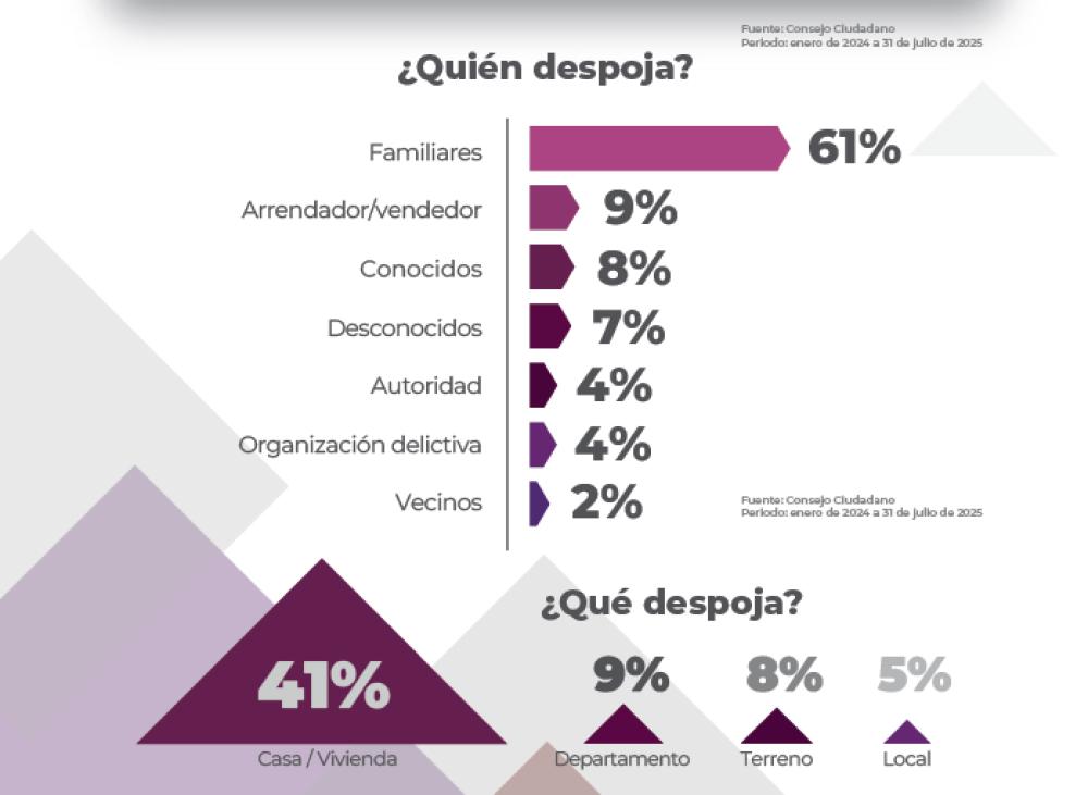 A diferencia de otros delitos, el Consejo Ciudadano explicó que hijas, hijos o personas cercanas se convierten en los principales responsables del despojo familiar, aprovechándose de la confianza y de la vulnerabilidad para quedarse con viviendas, terrenos o recursos económicos.