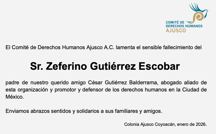 El Comité DH Ajusco lamenta el fallecimiento del Sr. Zeferino Gutiérrez Escobar. comiteajusco8 enero 2026Historia del Comité Ajusco Navegación de entradas Anterior Comparte esto: Compartir en X (Se abre en una ventana nueva) X Comparte en Facebook (Se abre en una ventana nueva) Facebook Me gusta Cargando... Relacionado